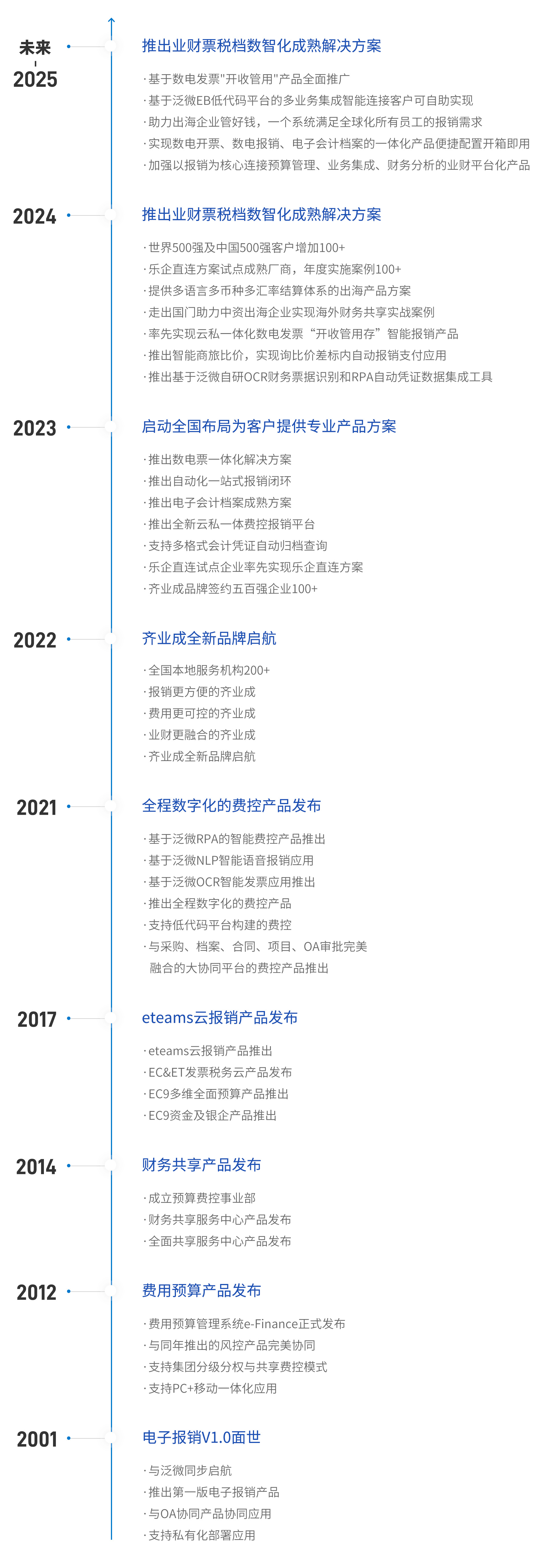 最初为解决无纸化报销和办公需求,我们推出了电子报销流程1.0产品;随后为实现支出合规管控,推出费用预算产品;为实现集团共享型组织管理,推出财务共享服务;为满足企业上云的需求,我们推出费控SaaS版产品;在“大智物联”的背景下,融合智能化和数字化技术后,推出全新一代全程数智化费控产品;历经二十多年深耕业财税票领域,聚合万千生态资源,服务超过万家中大型客户,齐业成全新品牌启航。