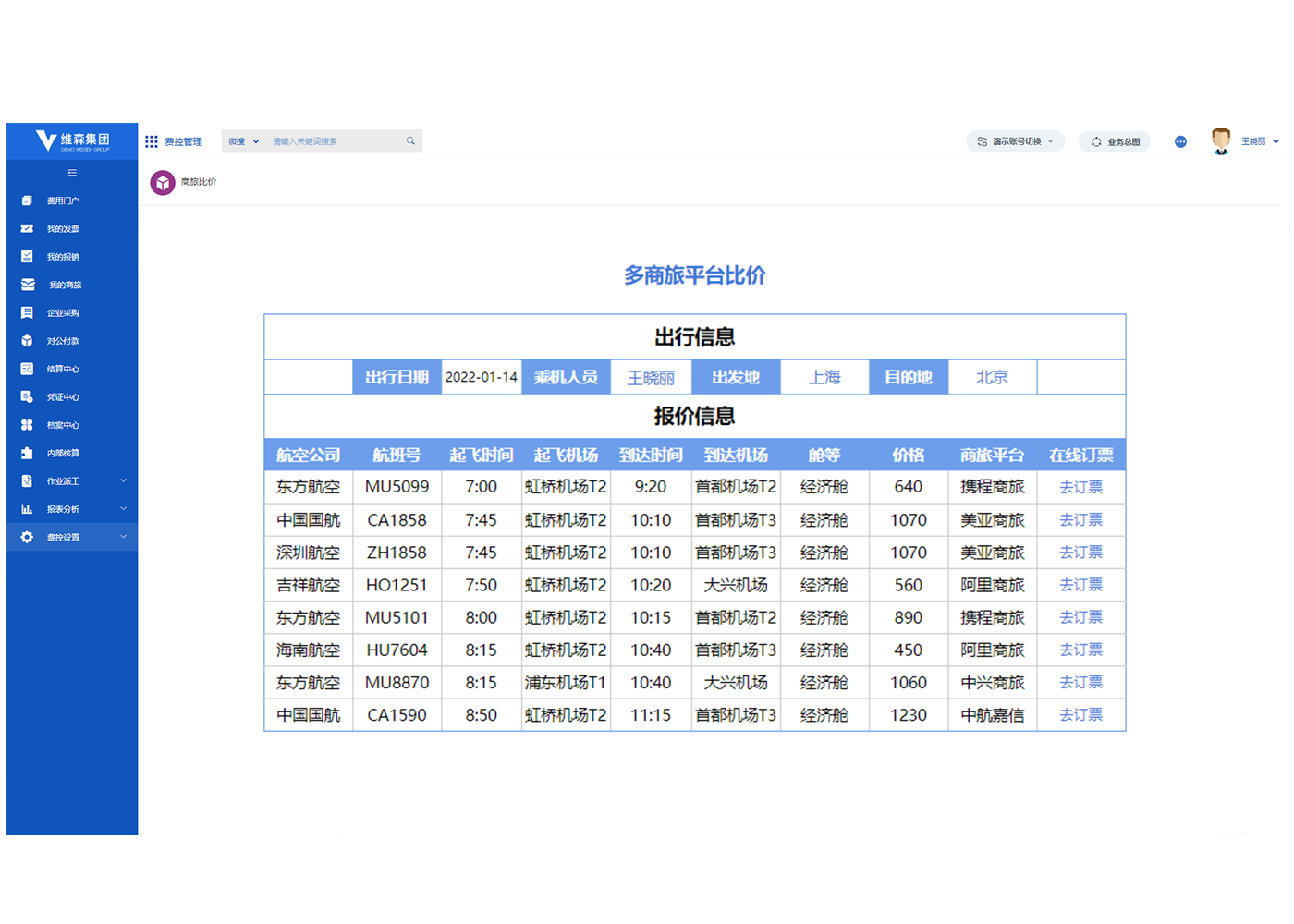 - 配置化就能够实现与多个商旅平台的信息对接、差标对接和商旅对账,并支持多商旅平台比价。对于网约车平台(如滴滴出行、高德、美团打车等)的打车费用报销,选择费用发票后,可以自动关联带出行程单和出行信息,减少移动报销手工填写工作量。