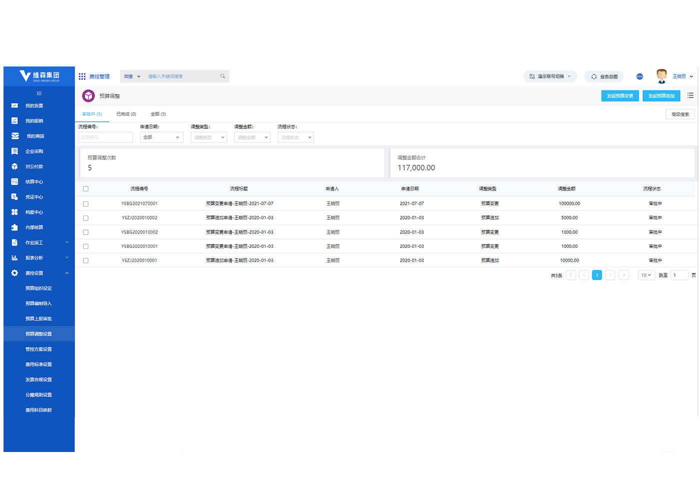 - 当预算金额不足或项目取消等原因需要进行预算追加、追减操作时,可通过系统流程进行处理,保证预算调整的规范性、可追溯性。预算调整后可形成历史记录信息,便于统计查询与责任追溯。